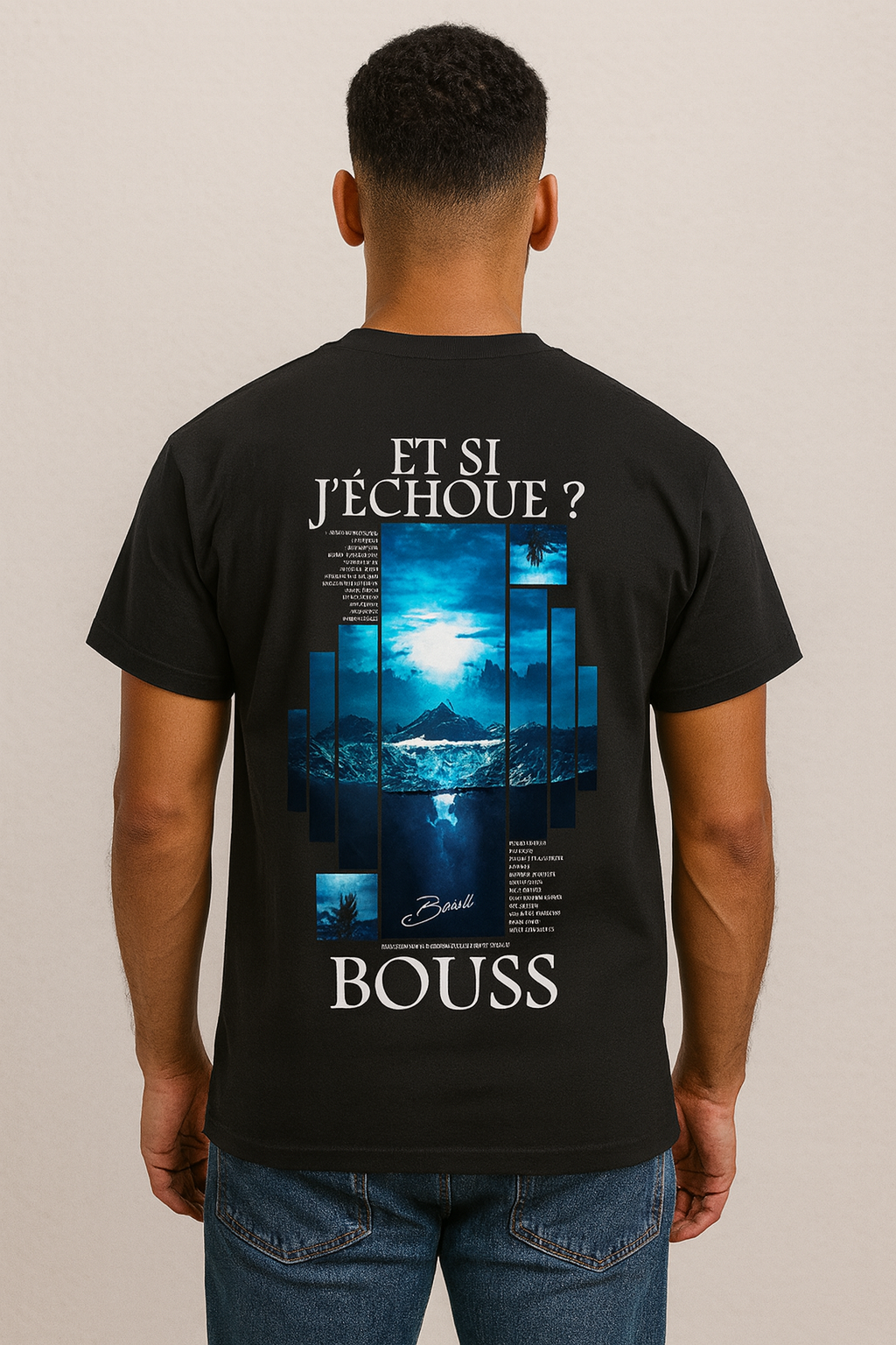 Inspiré de l’album « SI J’ÉCHOUE ? » du rappeur francophone Bouss, ce t-shirt met en avant un visuel fort au dos, directement lié à l’univers introspectif et artistique du projet. L’avant reste volontairement sobre, avec une inscription discrète, pour un contraste élégant et percutant.